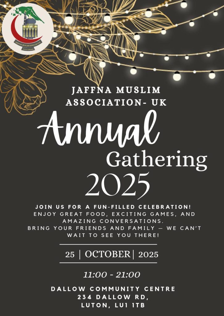 இன்ஷா அல்லாஹ்… *Jaffna Muslim Association – UK* நிறுவனத்தினரால் வெகு சிரத்தையுடன் உங்களுக்காக ஒழுங்கு செய்யப்பட்டுள்ள சமூகத்தின் ஒருங்கிணைப்புக்கான இவ் ஒன்றுகூடலில் நீங்களும் உங்கள் குடும்பம் சகிதம் கால தாமதமின்றி வந்து அனைத்து நிகழ்ச்சி நிரல்களுடன் அருசுவை மதிய போஷனத்திலும் கலந்து நிகழ்ச்சியை சிறப்பித்து தருமாறு ஆவலுடன் எதிர்பார்க்கின்றோம். – JMA TEAM -25
